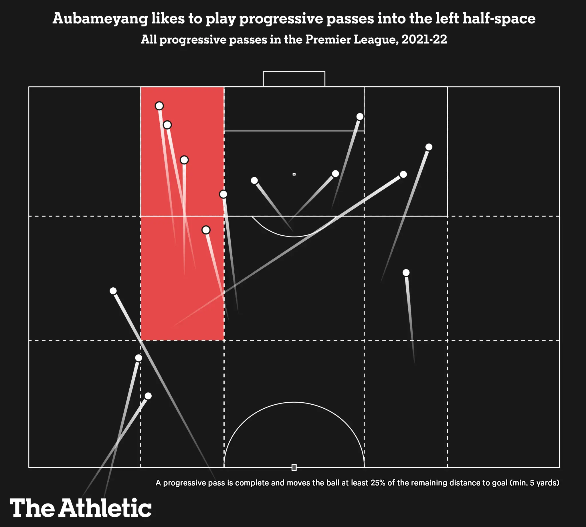 ობამეიანგს შეტევის გაგრძელება მარცხენა ნახევარსფეროში უყვარს, არა მხოლოდ აჩქარებით, ან დრიბლინგით, არამედ პასებითაც. მიმდინარე სეზონის მონაცემებშიც კარგად ჩანს, რომ ობა ხშირად ირჩევს შეტევის განსავითარებლად მარცხენა ნახევარსფეროს.