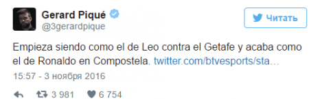 "ბარსელონას" მამაკაცთა გუნდის მცველმა, ჟერარ პიკემ საკუთარ ოფიციალურ Twitter-ზე ეს შესანიშნავი მომენტი, ლიონელ მესისა და რონალდო ნაზარიოს გოლებს შეადარა.