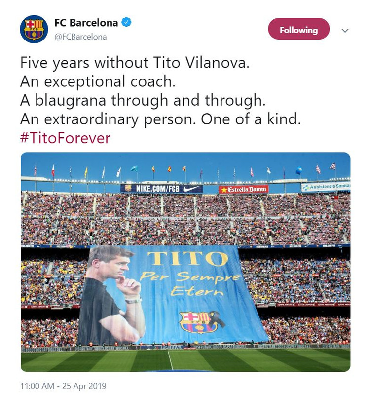 "ხუთი წელი ტიტო ვილანოვას გარეშე. საკვანძო მწვრთნელი. ბოლომდე "ბარსელონაში", დასაწყისიდან და დასასრულამდე. არაორდინარული ადამიანი. ერთადერთი და განუმეორებელი."