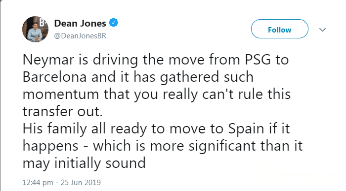 ჯონსმა Twitter-ზე დაწერა, რომ ნეიმარს "ბარსელონაში" დაბრუნება სურს და ამ ამბავმა ისეთი მითქმა-მოთქმა გამოიწვია, გამორიცხული არ არის ტრანსფერი მართლაც შედგეს. ასევე, მან დაამატა: "ბრაზილიელის ოჯახი მზადაა ბარსელონაში დაბრუნდეს" - ამას კი დასძინა: "ეს ინფორმაცია იმაზე მნიშვნელოვანია, ვიდრე ერთი შეხედვით შეიძლება მოგეჩვენოთ."