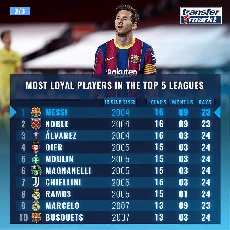 33 წლის ლიონელ მესი უკვე 16 წელია "ბარსელონას" ღირსებას იცავს, უფრო კონკრეტულად, არგენტინელი პირველ გუნდში უკვე 16 წელი, 9 თვე და 23 დღეა გამოდის, საფეხბურთო პორტალმა Transfermarkt-მა კი ის ევროპაში "ყველაზე ერთგულ" ფეხბურთელად დაასახელა.