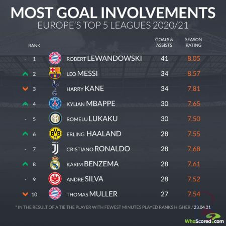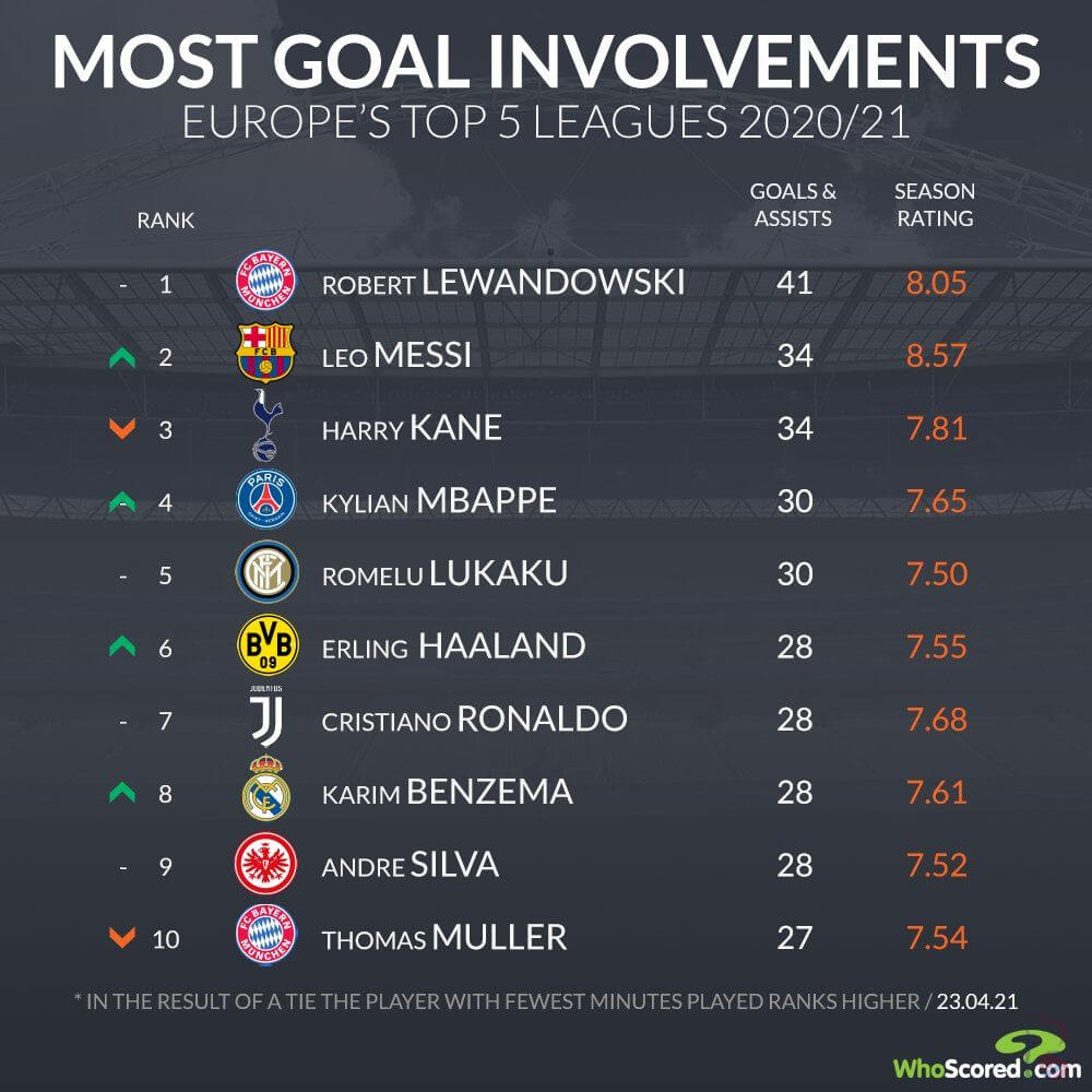 ლეოს მსგავსად 34 გოლში აქვს კონტრიბუცია ჰარი კეინსაც, თუმცა არგენტინელს ეს ნაკლებ თამაშში აქვს შესრულებული, შესაბამისად Goal Ratio-ც მეტი აქვს.