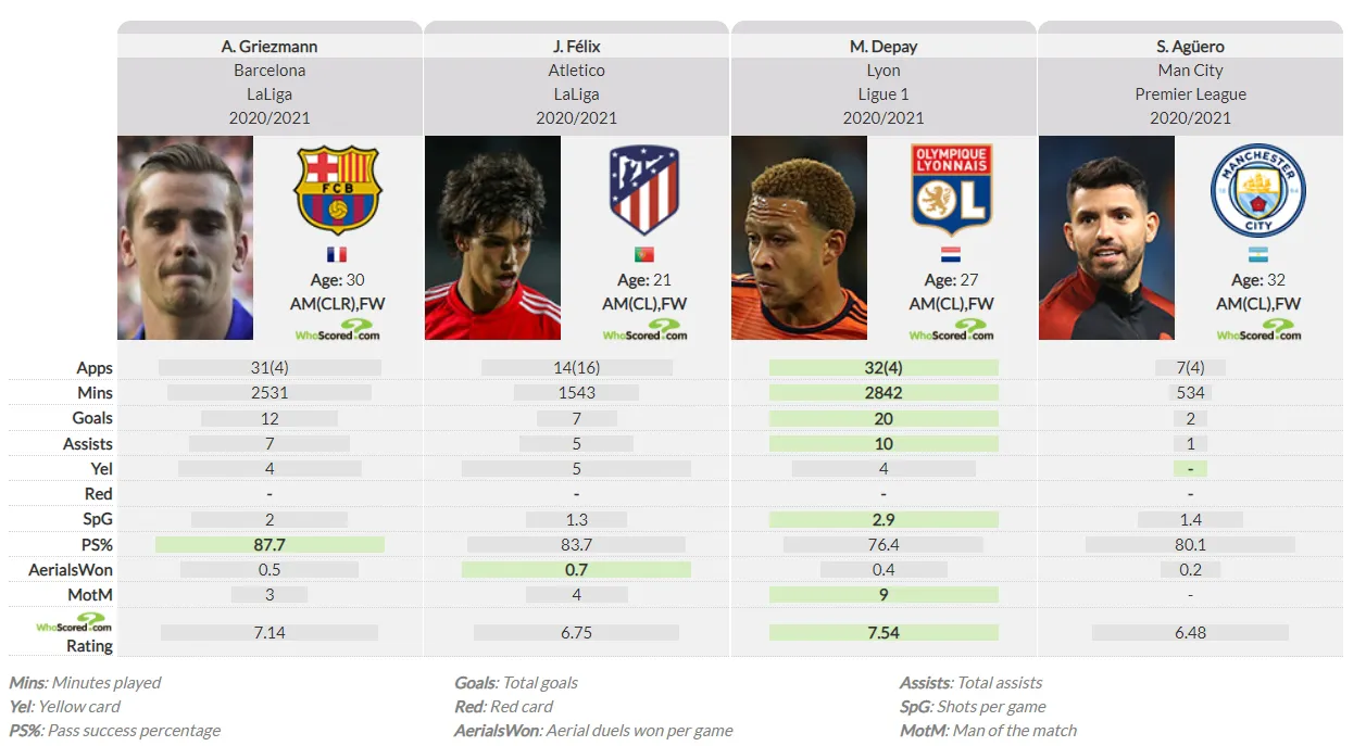 მემფისმა, რომელიც თებერვალში 27 წლის გახდა, მიმდინარე სეზონში, ლიგა 1-ის 36 შეხვედრაში 20 გოლი გაიტანა და 10 ასისტი გააკეთა, ხოლო გრიზმანმა ლა ლიგის 35 მატჩში 12 გოლი გაიტანა და 7 ასისტი გააკეთა.