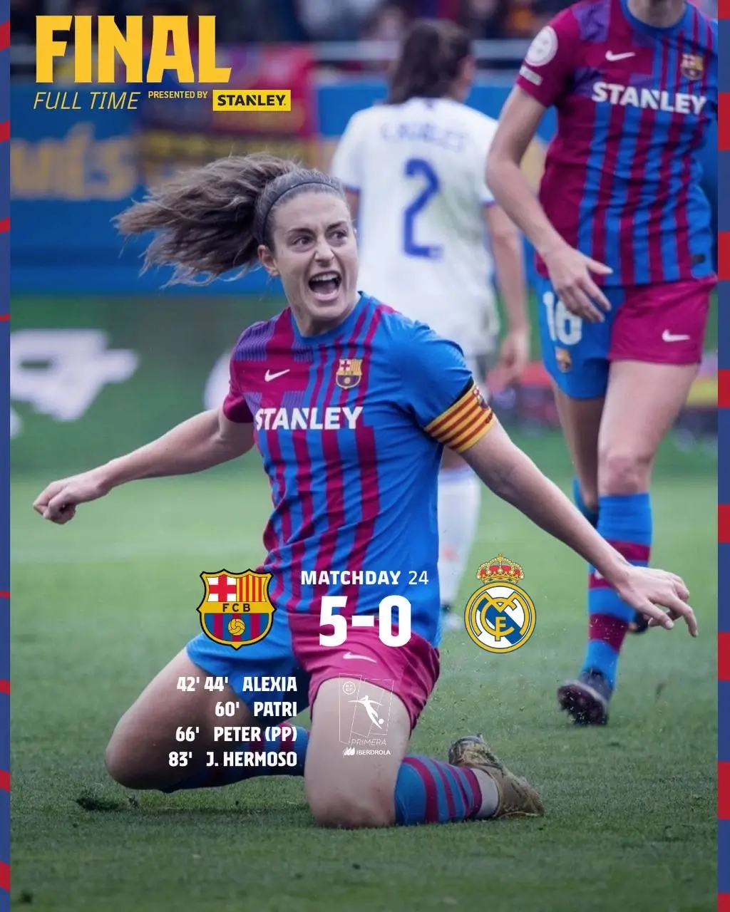 დღეს ჩვენმა გოგოებმა მადრიდელთა წინააღმდეგ 5-0 იმარჯვეს - მეტოქის კარში გოლების ავტორები ალექსია პუტელიასი (2), პატრისია გიხარო და ჯენიფერ ერმოსო არიან, ერთი ბურთი კი თავის კარში ბაბეტ პეტერმა ჩაჭრა.